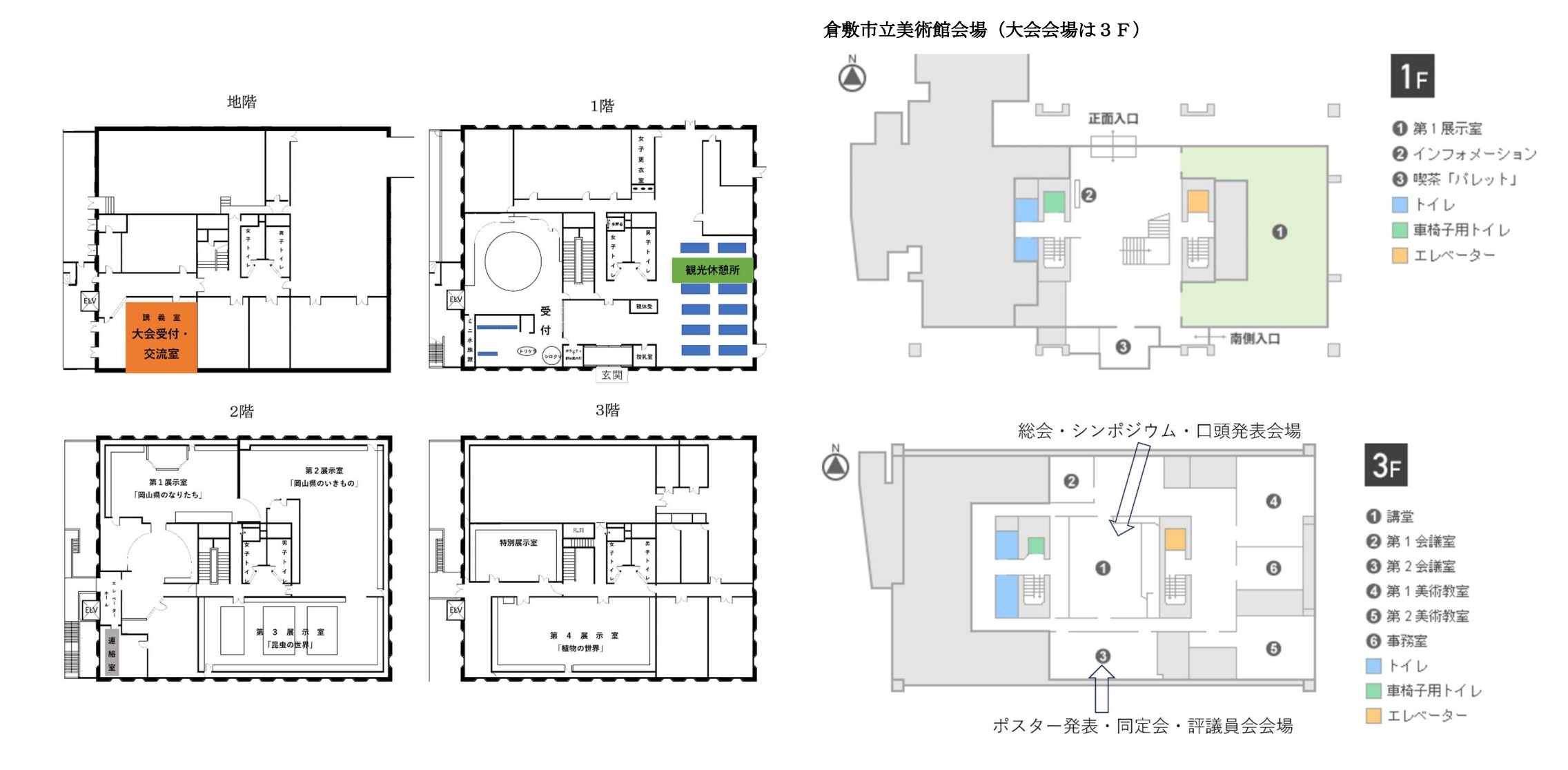 ・評議員会(1日目午前)・標本同定会の開催場所を記載 ・一般講演の申込みが多い場合、1日目午前にも行ないます。 ・公開シンポジウム登壇予定者の記載 ・博物館会場地階講義室は大会受付兼交流室としてご利用いただけます。 ・持ち込みの食事は博物館1階観光休憩所または地階講義室(交流室)をご利用ください。 ・大会期間中,倉敷市立自然史博物館の展示を無料でご観覧いただけます.博物館受付で名札をご提示ください. |